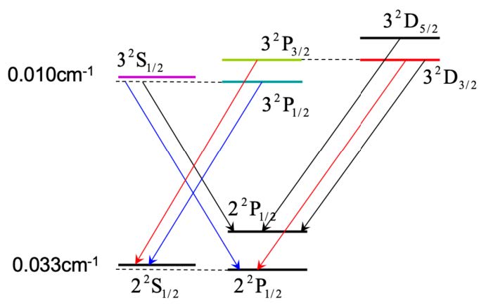 图 1: 锂原子能级能级的精细结构及允许跃迁