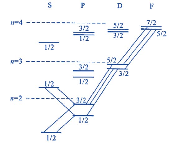 自旋 − 轨道耦合 使得 同一l能级进一步分裂为两个值 (能级精细结构)