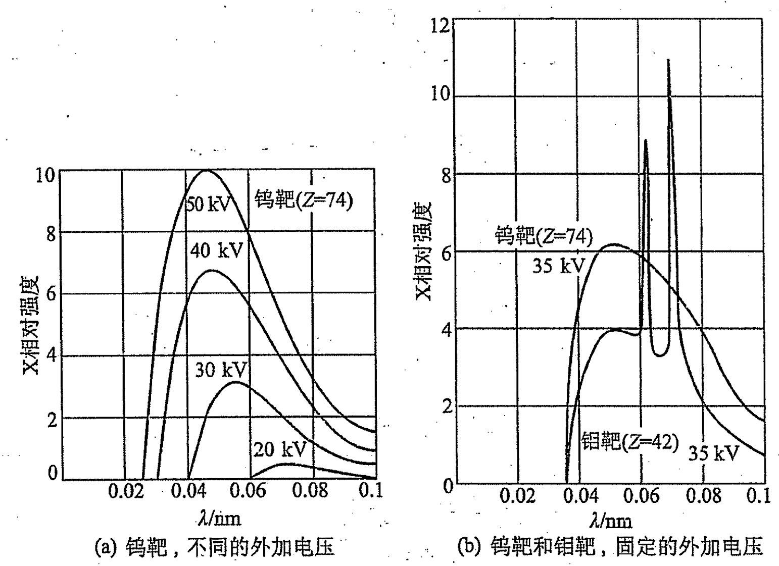 (1) X 射线的连续谱:带电粒子与原子(原子核)相碰撞,发生骤然减速时,动能->辐射能,由此伴随产生的辐射为轫致射辐。