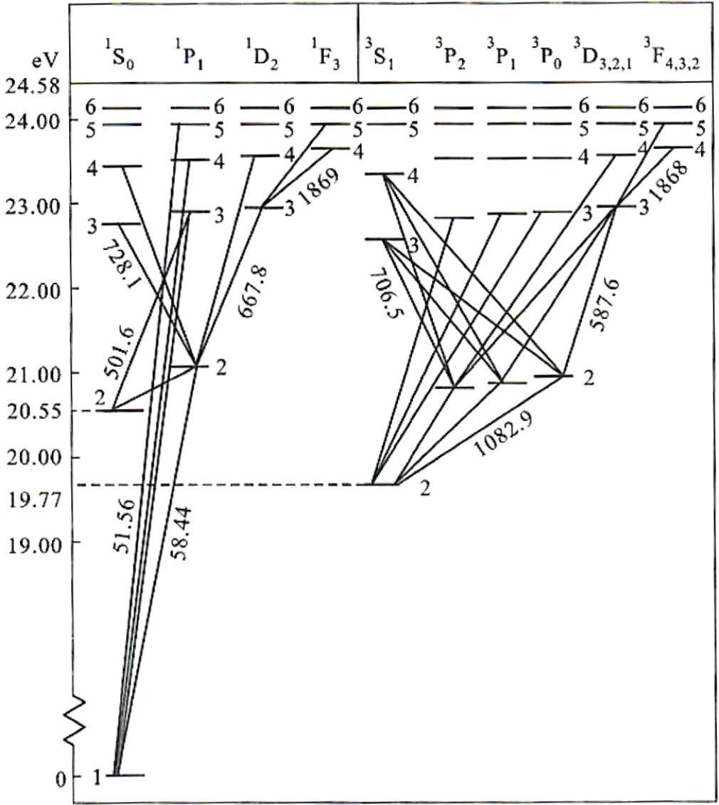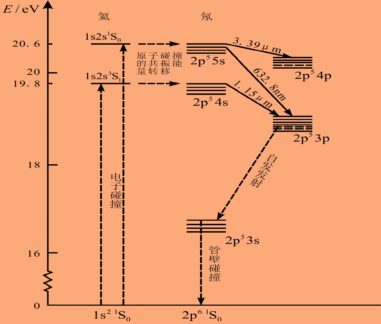 电子经电场加速后,与$\mathrm{He}$碰撞。处于激发态的$\mathrm{He}$与$\mathrm{Ne}$碰撞,把能量传递给$\mathrm{Ne}$,使它在亚稳态$(2p^{5}5s$、$2p^{5}4s$ )和激发态($2p^{5}4p$、$2p^{5}3p$ )之间形成反转分布。